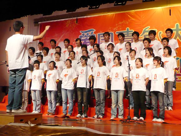 在大合唱比赛中,每个班级都用各自独特的方式表达着自己的爱国热情,奥运激情和对灾区同胞的深深牵挂:有的班级在合唱过程中站成“爱心”的队形;有些班级用手语表演表达对灾区的关心和对奥运的支持。