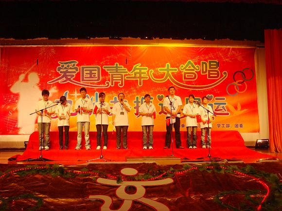本次合唱比赛以“爱国青年大合唱,九洲共振迎奥运”为主题,经过初赛的选拔,最后十支队伍来到了本次合唱比赛的决赛现场。晚会上,每位师生都手系飘扬的黄丝带进入大剧院,为地震灾区的受难同胞祈福,向他们送去我们的祝福,用歌声传递勇气和力量。
