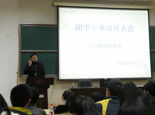 3月1日下午,团学干事动员大会在精技楼503室隆重举行。院团委副书记励宁老师主持了本次会议,院团委、学生会的各部门负责人以及干事参加了本次动员大会。 首先,院团委寿益菲、黎帅、俞杭杭、何峰等七位负责人以及学生会应天?、林西西、杨煜程、梅珍珍等10位干部依次上台对各自部门的工作职能做简单的介绍,并对本学期的工作计划做了汇报。随后,励宁老师就以上学生干部的发言做了分析和点评,强调学生干部要时刻注意自己的工作态度,认清自己的职责,以“为学生服务”为工作宗旨,并以苏志刚院长会议上的一句语录“细节决定一切”来指导学生干部的日常工作。