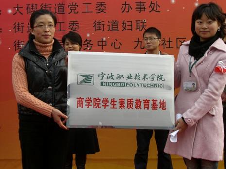在我院商学院团委书记陈含英老师掷地有声的书写中,我院与九峰社区志愿者服务站正式签定了协议,现场响起一片热烈的掌声。而8:40分的授牌仪式更成为了全场的焦点,“宁波职业技术学院商学院学生素质教育基地”正式向社会宣告它的诞生。当那面红色的志愿者旗帜在队长张洪波手中飘舞时,成为当时现场最亮丽的一道风景线。