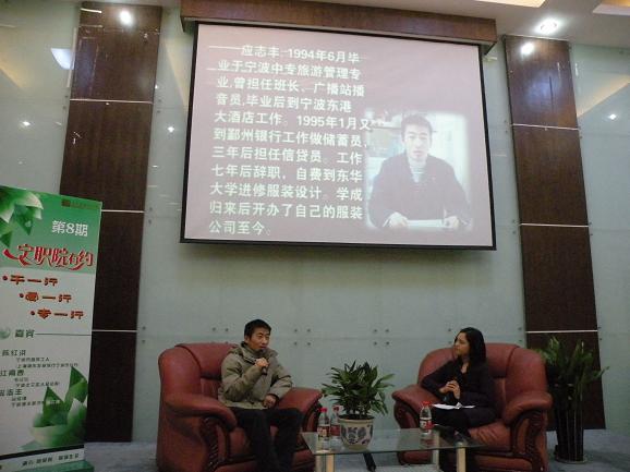 3月9日晚,由学工部主办、商学院和学生会承办《宁职院有约》第八期访谈录在明德楼105举行,本期访谈节目以“干一行,爱一行,专一行”为主题,邀请到了宁波源丰服饰有限公司总经理应志丰、宁波北仑区人民法院书记员江南春、上海浦东发展银行宁波支行首席工人陈红洪三位宁波中专的校友,为大家讲述了在职场上的打拼历程。院党委副书记史习明,学工部部长何明友,商学院党总支副书记董鸿安,商学院副院长裘腰军,以及各分院领导和老师出席了本期节目。