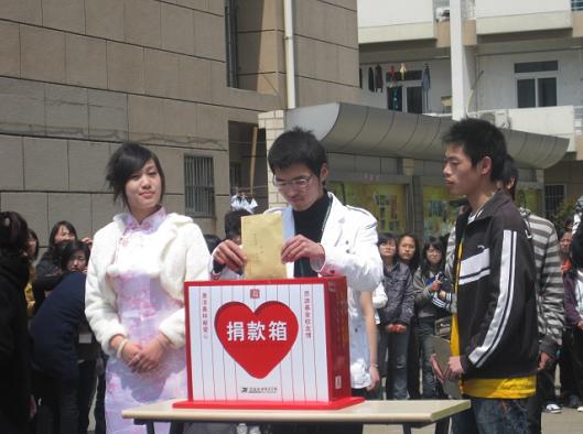 随后,义卖活动中央也摆上了舞台,社团联各协会通过自己的演出来赞助本场义卖活动。蛋壳乐队一首首感人的演唱,时装队的时装秀,书法协会的现场作画,滑轮协会的轮滑表演,其中一曲《爱的奉献》音乐声响起时,院团委、学生会、社团联的学生干部纷纷走上舞台向思源基金捐助了自己的一份爱心,这更是成为本场活动的一个亮点。院团委副书记励宁老师和学工部张超老师一同接受了美食协会送上的精美蛋糕,同学们可以通过低价售出自己亲手做的蛋糕,不仅展示了自己的才艺,更为思源基金献出了一片爱心。