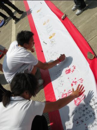 1000余名宁职院学子用同升国旗,同宣誓言,同唱“没有共产党,就没有新中国”爱国歌曲的方式来纪念五四运动九十周年,宣告青年学子的青春誓言、刻不容缓的历史使命和坚定不移的崇高志向。社团联章丹烽作为代表上台领誓,他用“校园英雄”的誓言勇挑历史使命的心声。