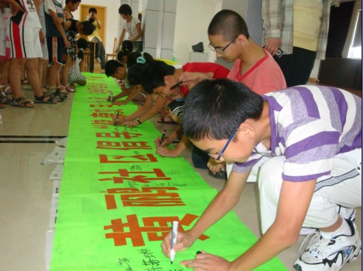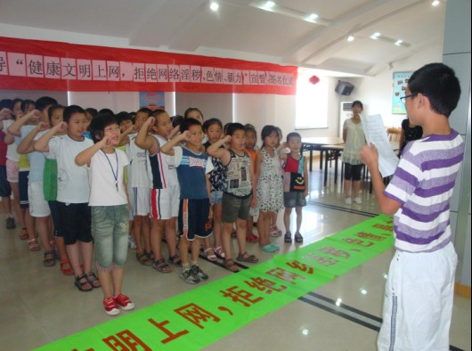 7月15日上午,黄鹂社区暑期假日学校倡导“健康文明上网,拒绝网络淫秽、色情、暴力”宣誓签名仪式在社区五楼多功能厅举行。仪式由电子系支教小分队组织,暑期假日学校四十余名学生参加了这场仪式,社区沈主任主持。