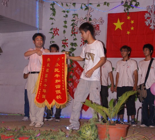 为建立和谐假校,感谢民丰村对志愿者支教的支持,华丰学院民丰支教的志愿者为民丰村送上了锦旗。一些村民还拿来了西瓜。周书记说:我仅代表民丰村的父老乡亲们对你们表示深深的感谢,你们的辛勤付出我们都看在了眼里,记在了心里,这个暑期你们又给这里送来了欢乐,送来了知识,我们真诚的的希望你们明年再来,民丰村是你们永远的家。”