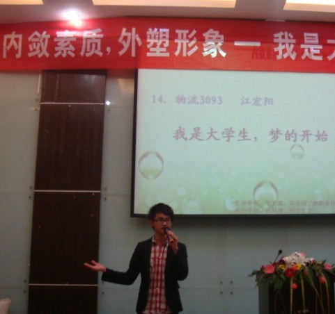 “我是大学生――梦的开始,有梦心才会燃烧,有梦船才会远航,人生因有梦而美好,人生因有梦而有憧憬。”14号选手物流3093班的江宏阳用一段抒情的话语开头,迎着《天空之城》的舒缓音乐,悠悠的起航。清晰流畅地表达,大方得体的展示,台下掌声雷鸣。