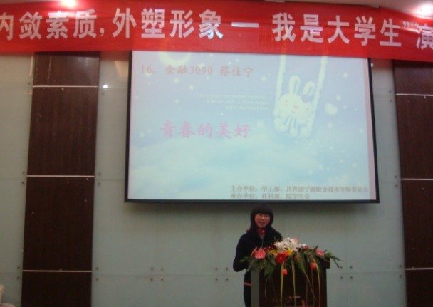 内敛素质,外塑形象,我是大学生,大学生就是我,给我一个舞台,我能创造一个大学生的精彩。12月17日晚,由学工部、共青团宁波职业技术学院委员会主办,社科部、院学生会承办的“内敛素质,外塑形象――我是大学生”演讲比赛决赛在明德楼105开场。担任本次比赛的评委有院团委书记励宁老师、社科部周碧蓉老师、学工部刘光艳老师、社科部王恩妍老师、院学生会主席吴华君。