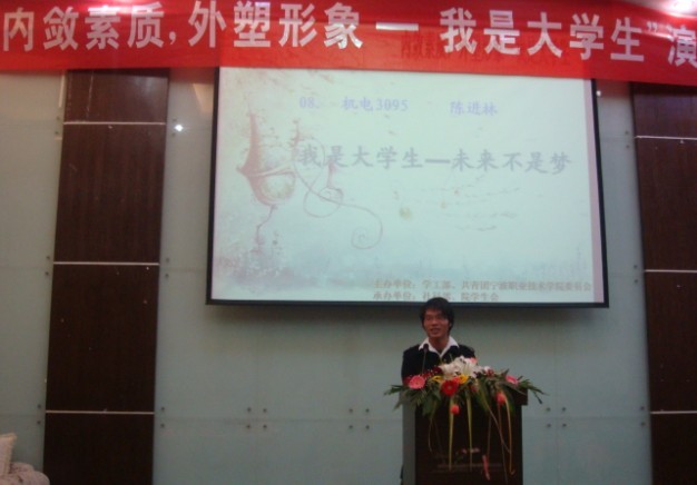 8号选手陈进林青春洋溢,充满自信,用青春的不羁的方式演绎不一样的大学。陈进林的“好多个第一次,让他不得不有好多个必须,《我是大学生――未来不是梦》,”他用亲身经历的阐述了一个阳光朝气大学生的追求,他说:“参加一次比赛,就是向对梦想再一次迈进。”他表示:代表机电系参赛,老师对他充满了希望,同学一次又一次的鼓励,朋友也一直激励他,让他跨过一次又一次挫折,打败一个又一个对手,走到了现在,所以要把最 优秀的自己表现给大家。陈进林是班级班长、组织部部长,他一贯秉承着诚恳、和善的态度对待一切。他说:“我对大学生的理解,就是自信,带着微笑去创造属于我的天空,并且要在学习实践中不断总结,改正,然后提升自己,为今后走上社会打下坚实的基础。”