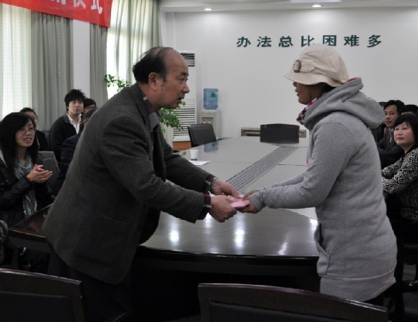 仪式上,张昌华会长说,杨维同学不幸患病,社会各界得知后,都非常关心。慈善总会了解后,也很重视,经过商议,决定捐赠一万元钱,以帮助解决杨维同学当前的困难。“希望你能勇敢的战胜病魔,尽快康复。”张会长亲手把一万元善款交到杨维同学的手中。随后,他还高度评价了我院 “思源基金”, 希望思源基金作为一门课程,能够越做越好。