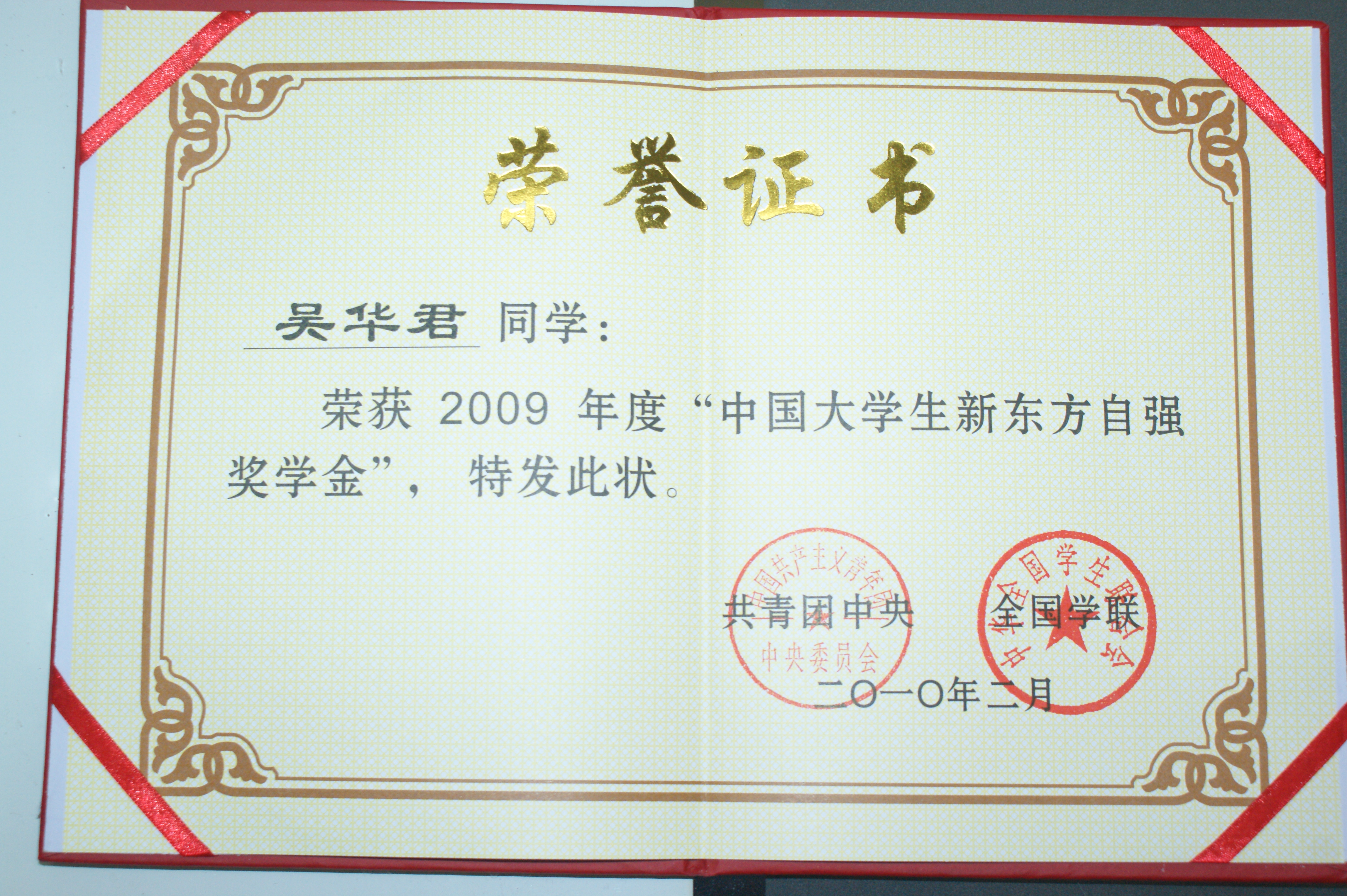 日前,由共青团中央、全国学联联合主办,中国青年报社和中国高校传媒联盟承办,新东方科技教育集团协办的2009年度“中国大学生自强之星”、“中国大学生新东方自强奖学金”评选活动结果揭晓,我院国贸3083班吴华君同学荣获2009年度荣获“中国大学生自强之星”提名奖,“中国大学生新东方自强奖学金”。
