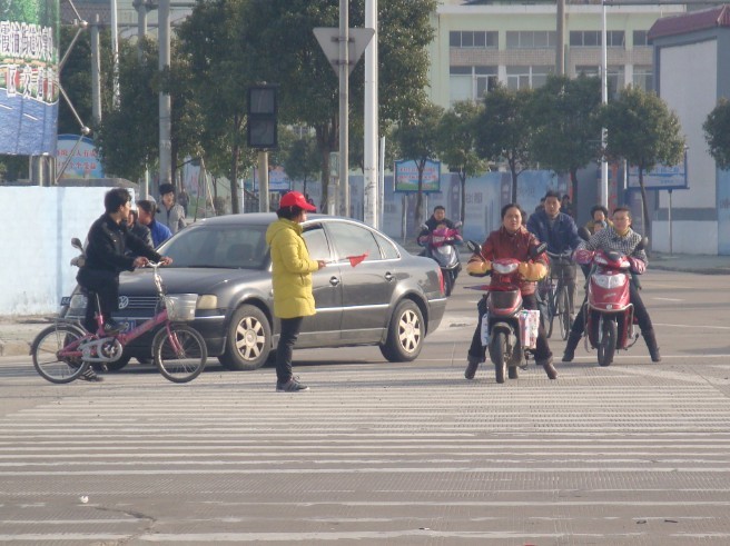 由于宁波市北仑正在修整公路,交通状况不是很理想,车流量大的十字路口经常出现越线、闯红灯等违规现象。近日,志愿者们穿上了协警的制服,挥舞着小黄旗,在宁波市北仑的凤凰社区为车辆和行人提供交通信号,这新增的交通协警的身影响应了我们“精彩世博?文明先行”的口号,这是我们为迎接即将到来的上海世博会打出的口号。