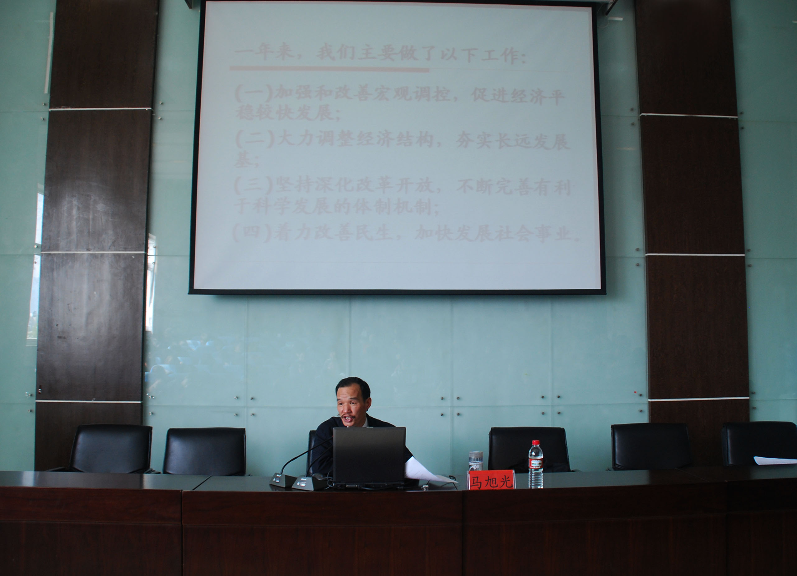 马老师首先简单介绍了政协第十一届全国委员会第三次会议和中华人民共和国第十一届全国人民代表大会第三次会议,并阐述了“两会”与七大、八大等会议之间的区别。在讲到两会会议主要议程时,马老师说:“无论是政府报告还是表决过程都愈来愈民主,中央领导会听取各分组的意见和建议,而各个分组讨论的细节和得出的结论都会通过媒体告知人民群众。”接着马老师以具体举例的方式为我们详细地介绍了2010年《政府工作报告》的大致内容,其中具体讲到了报告中关于2009年的政府工作回顾和相应的体会以及2010年的主要任务。马老师希望大家了解政府今年经济社会发展的主要预期目标―― 国内生产总值增长8%左右;城镇新增就业900万人以上,城镇登记失业率控制在4.6%以内;居民消费价格涨幅3%左右;国际收支状况改善。通过经济形势的发展变化及时调整自己的职业生涯规划,帮助自身更好地发展。政府将在今年重点抓好八个方面工作: (一)提高宏观调控水平,保持经济平稳较快发展; (二)加快转变经济发展方式,调整优化经济结构; (三)加大统筹城乡发展力度,强化农业农村发展基础; (四)全面实施科教兴国战略和人才强国战略; (五)大力加强文化建设;(六)着力保障和改善民生,促进社会和谐进步;(七)坚定不移推进改革,进一步扩大开放;(八)努力建设人民满意的服务型政府。