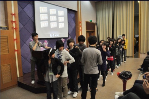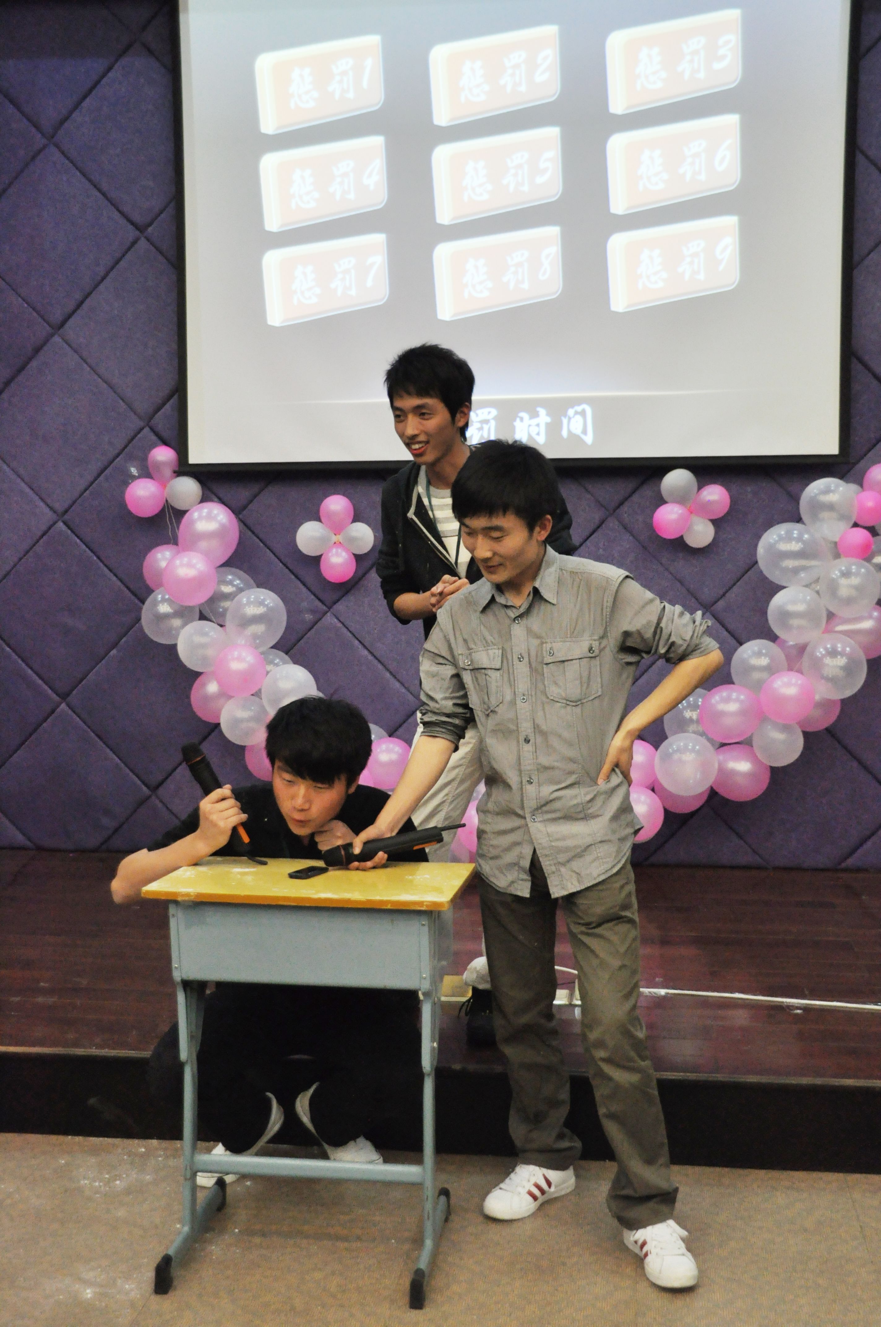 活动过程中穿插了许多游戏和小竞赛:如请同学们回答有关学生会学院发展历史以及世博会的相关问题,回答错误的同学将会受到惩罚。本次活动的惩罚也是别出心裁的:隔膜接吻、大冒险、喝矿泉水等,全场笑声、掌声不断。