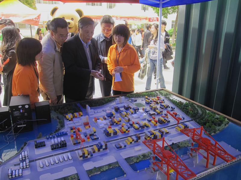 大型物流港口沙盘也在今日与大家见面了,所展示的沙盘,主要分为办公区和集装箱堆垛场。现场有物流专业的同学细心地为大家讲解,其间宁波职业技术学院院长贺贤土先生、党委副书记史习明老师等领导老师前来观赏,高度赞赏了管理系将沙盘搬上创业街的创意。其很好的展示了物流的专业特色,让同学们了解物流专业并能够更好的认识北仑港。
