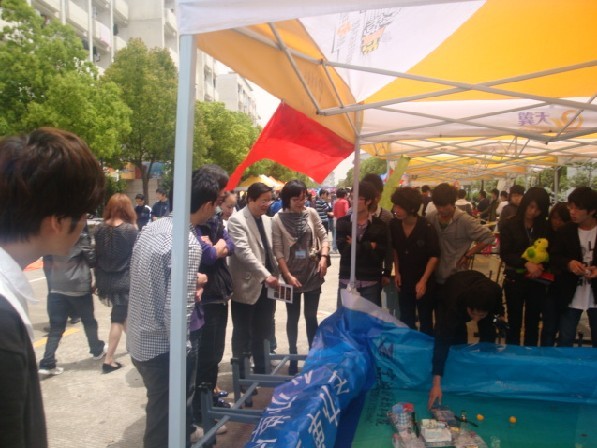 展区的最右侧有个大水池,这是我们“绿色航母”的展示区域,学生熟练地操纵着手中的遥控器,一只只散落在水中的乒乓球被打捞起来,这是水上垃圾收集的缩影版,“绿色航母”是机电系学生机械创新设计的作品,充分展示了机电系学生们的动手能力。人潮一浪接一浪,机电系的DV展区的观客也围成一团看的相当投入,DV拍客项目是机电系专业技能展示的载体,片中有实训课时老师指导学生学习专业技能操作过程,有部分可操作性的机械加工过程的特写,有针对PROE 或CAD 的三维立体设计的整个过程记录等。