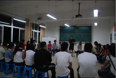 针对本次素质拓展,励书记选取了show show我的组、“盲人和哑巴”两个具有代表性的游戏。首先,励书记要求到场的所有学生干部们随即分成三组,每组要求完成一定的任务,比如决定自己的队名、队徽、队训、队歌、队旗等,并要求向在场的同学介绍自己的小组,通过自己的方式向大家展示自己。组员们在经过20分钟的激烈讨论后,用各种多姿多彩的表演为我们展现了他们团队各自的特色,如:NO?一家人,ELEVEN等,大家呼喊口号,其喊队训,团队合作能力慢慢在成员们之间凝聚。随着活动气氛的高涨,大家对第二个游戏的积极性也越来越高,“盲人”在“哑巴”的帮助下,从迷茫、害怕到后来慢慢的放开自己,把自己交给哑巴,顺利的完成了游园活动,不少学生干部回忆起游戏,都说:“刚开始我们真的很害怕,怕摔跤,怕撞到东西,但是前面领路的同学给了我们希望,他们用各种方式提醒我们要注意,哪里该小心,哪里是台阶,哪里要蹲下,带路的同学都会一一提醒我们,所以在这里我们要感谢他们。