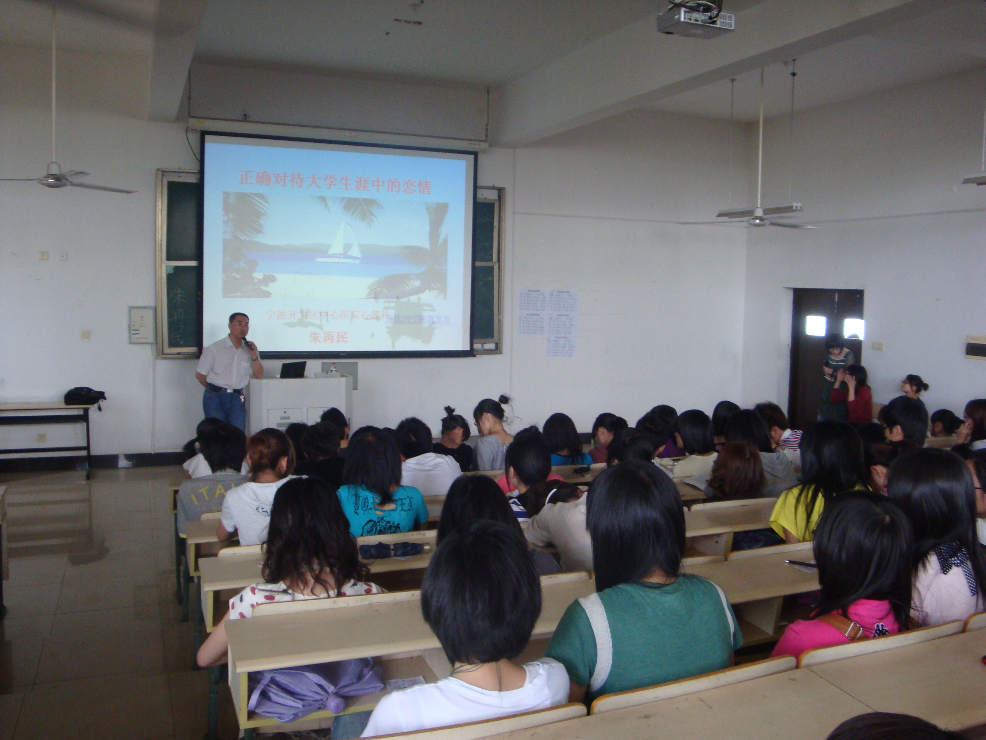 2010年5月27日,宁波职业技术学院应用化工系的同学们聚集在精技楼401教室,听由来自宁波开发区中心医院心理科的朱再民医师的一堂精彩的演讲――如何正确对待大学生涯的恋情.
