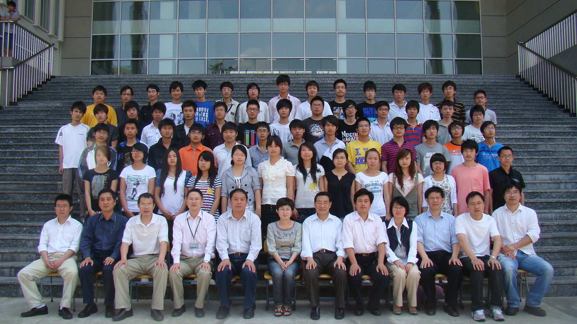 中午12:30前后,我系8个班级的毕业生们有序整队,他们面带微笑,衣着整齐得体,展现出了大学生阳光灿烂的青春风貌。另外,我系主任杨至德、副主任薄纪康、团委书记徐俊杰以及各班主任等也陆续到场参加到了合影留念活动中。