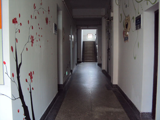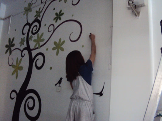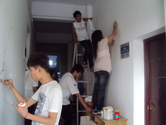 美校园环境,展艺术风采活动依然继续着,如今宣传部的同学们来到了华建软件学院团委办公室前,对齐两边走廊的墙壁进行美白,之后并用丙烯在墙上画上壁画。经过2天的努力,终于在6月3日前完成,美丽动人的壁画展现在众人面前。