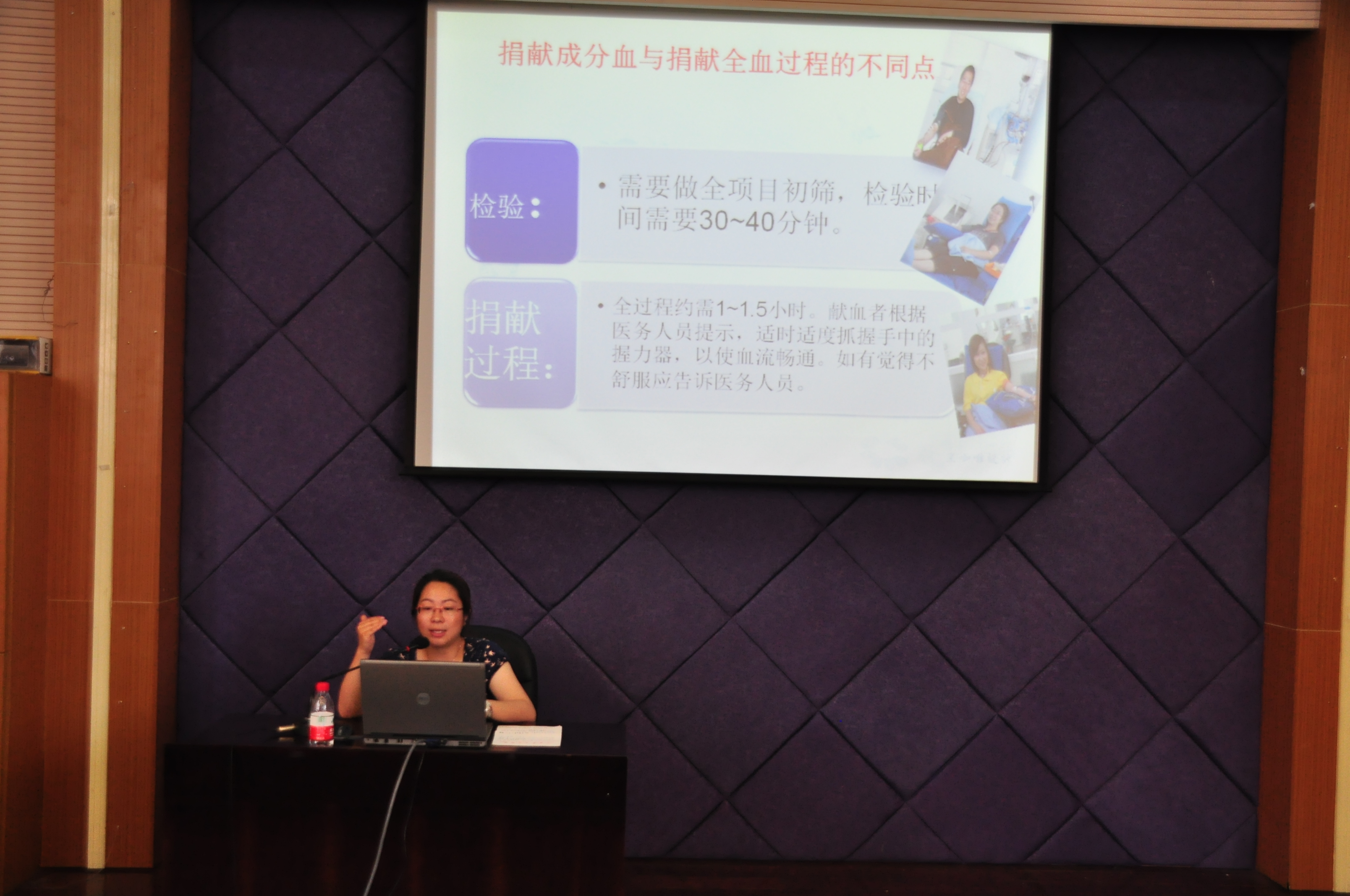 首先,朱老师给同学们介绍了献血前及献血后应该注意的事项,让每一个同学都能安全献血、合理献血,同时也消除了有的同学对献血的恐惧心理。朱老师说:“血液是拯救伤病员生命的重要物质,至今仍无法人工制造,只能依靠人们用爱心提供,所以只有无偿献血,才能从根本上清除有偿供血带来的弊病,血液质量才得到保证,才能保证受血者的安全,才能最大限度的降低血液传播疾病的危害。”同时朱老师还重点强调了无偿献血对我们自身的好处:1献血后会刺激造血器官即骨髓加速血细胞的生产使造血器官更加旺盛,促进机体的新陈代谢,有利于健康;2.定期献血可以降低血液中铁等一些金属的 含量,减轻解毒器官肝脏的负担,增强肝脏的功能;3.献血可以降低血脂和胆固液的浓度,降低血液粘稠度,起到稀释血液,加快血流速度,改善心、脑等器官的供血等等。同时朱老师也讲述了无偿献血的由来,从历史的角度上我们明白了无偿献血的意义重大。接着,朱老师又开展了一个献血知识问答活动,让同学们都积极参与到本次讲座中,同时还派发一些小小的纪念品。现场气氛十分活跃,同学们都踊跃回答问题,充分说明了大家对献血活动的关注,也从中收获了很多关于献血方面的知识。
