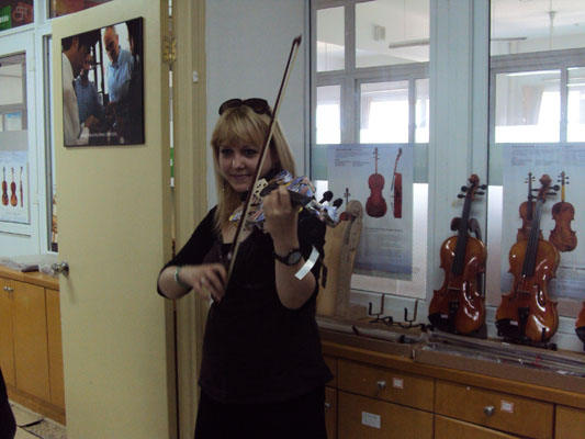 ▲ 提琴演奏家瓦妮莎.默拉德(VANESSA MOLLARD)现场对同学们所做的乐器进行试拉,并对其发出的优美音色进行称赞