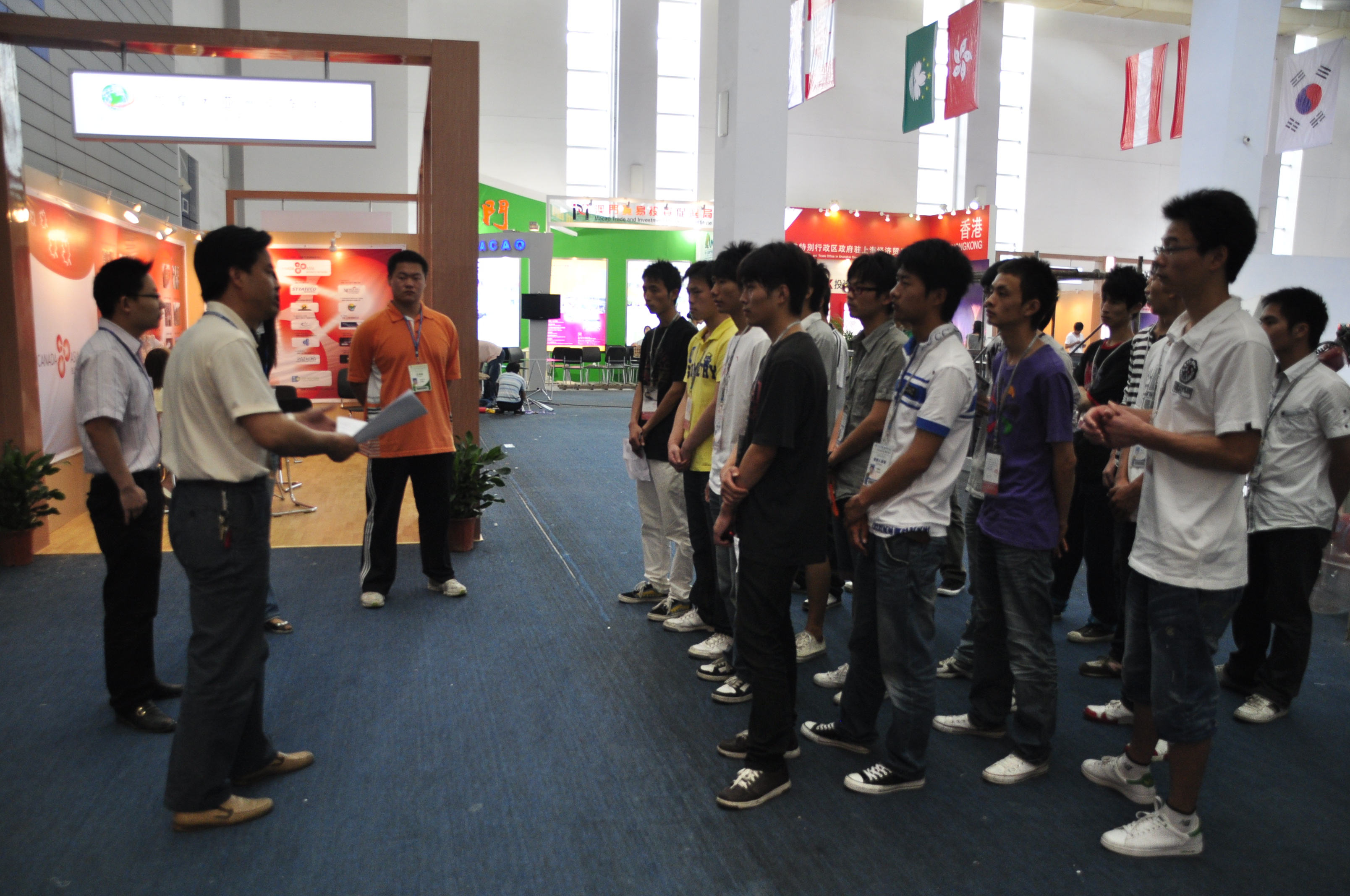 我校志愿者主要负责在国际馆的展位翻译以及安保工作。每位志愿者都面带微笑,负责安保的志愿者在回廊一侧整齐排列,并且帮助参展人员和参观来宾看管随身携带的物品,维持场馆通道秩序欢迎前来参观的嘉宾,而负责展位翻译的志愿者在进入各自展区后首先和展区负责人进行沟通,了解有关展区的一些基本情况,给参观者做简单的介绍,还将礼品、参展公司的简介放入礼品袋,双手递给前来参观寻求合作的嘉宾。