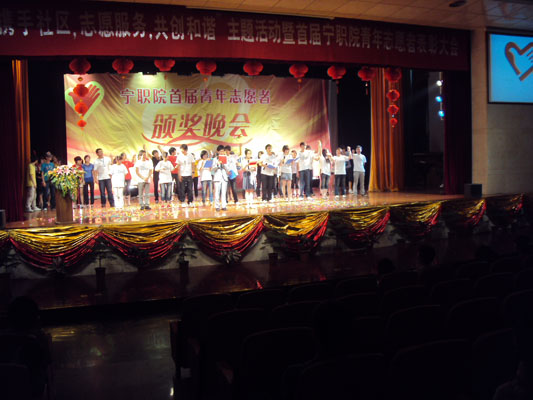 为表彰我院志愿者们对社会服务做出的贡献,为了感谢社区对志愿者活动的支持与帮助,进一步鼓励广大青年加入志愿者行列,弘扬志愿者精神。此次颁奖典礼将评选出我院十佳志愿者,优秀志愿者分队,先进志愿者服务队,优秀志愿者活动组织者,并有优秀志愿者代表上场发言,重点突出了我院志愿者是宁职人的闪亮名片,志愿者本着‘奉献、友爱、互助、进步’的宗旨,在志愿者活动中,风雨同行,志愿服务的精神。