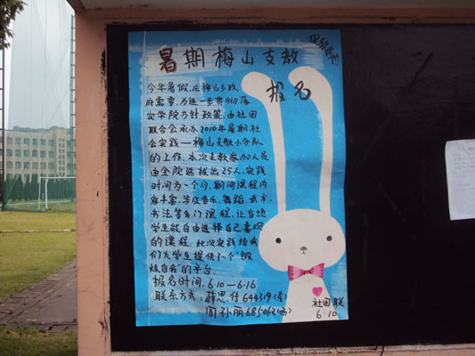 ▲校园内的每个角落都有暑期梅山支教小分队的报名海报