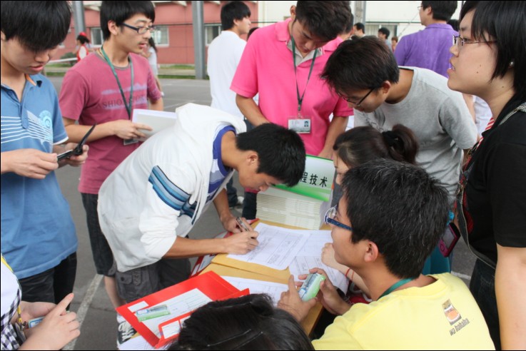 昨日我院2010届自主招生新生于东校区风雨篮球场进行报到工作,建筑系共安排了二十余名志愿者与学生会干部来帮助前来的新生。志愿者微笑着向新生说明填表的格式以及报到的步骤,之后再领着新生去交费、购买军装、带新生到寝室、向新生介绍宁职院等等,大大方便了当日到来的学生以及家长。