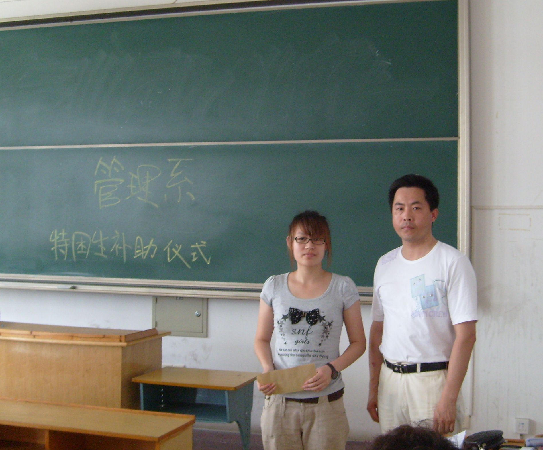 7月1日中午,管理系于明德楼203室举行了特困生补助仪式。管理系党总支副书记徐莺老师,副主任刘春朝副教授,团委书记赖敏雅老师等出席了补助仪式。