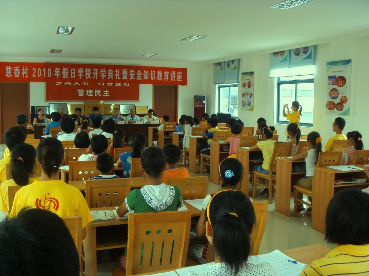 7月7日,在海口村居委会会议室举行了海口村2010年假日学校开学典礼.参加此次典礼的领导们分别有春晓镇团委书记王建斌,春晓镇居委主任柯什章,春晓镇秘书长刘伦坤海口村村主任周伟海, 海口村副书记也是我们假日学校校长陈可珠, 海口村老年协会会长郑国定, 海口村村官姐姐丁莉丽。