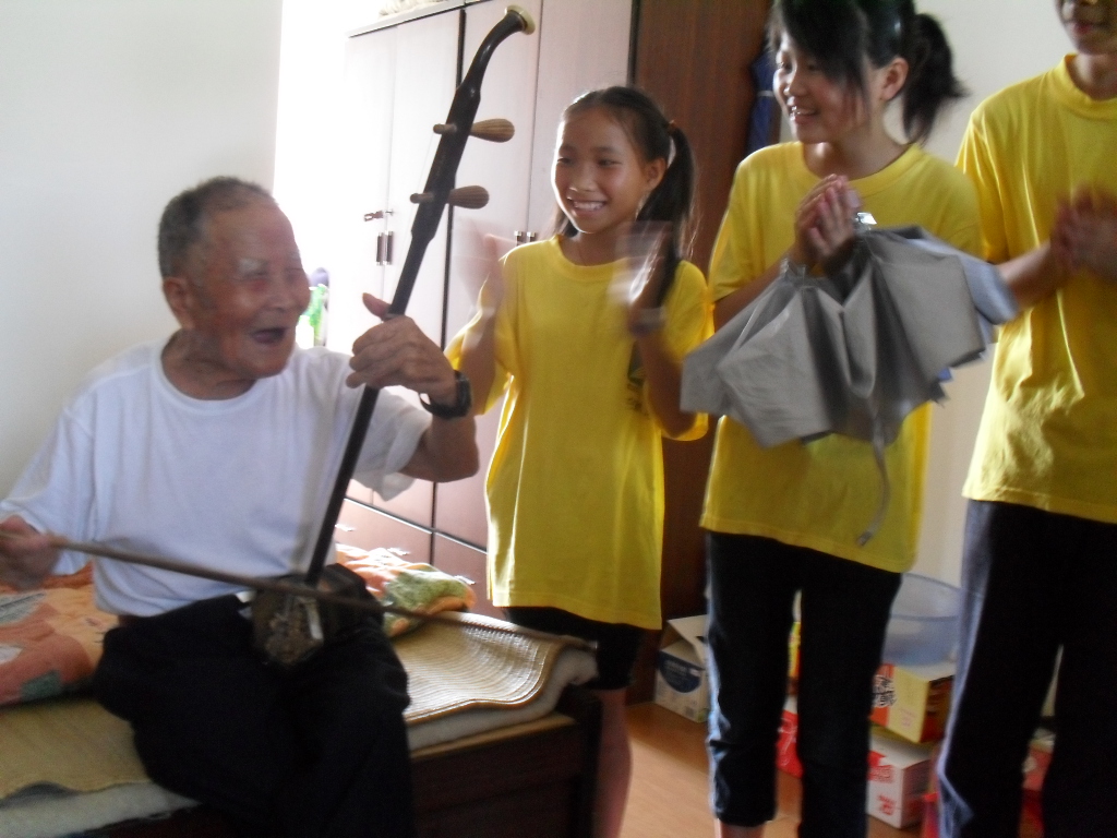 后来,院长带领我们访问了这里年纪最大的98岁高龄老人,她和其他四位老人住在一起,大家有说有笑,挺热闹的。院长告诉我们:“这里的老人有六个是九十岁以上的,有三十五位老人是由子女来提供伙食和医疗费的,还有十五位孤寡老人是由政府供养的,这里的卫生都是由春晓镇妇联的工作人员来收拾的,现在这里老人的状况和运营状况都挺好的。”随后,我们又去访问了其他老人,有的老人看到我们来了非常开心,把我们当作自己的子女一样,紧紧拉着我们的手,眼眶湿润润的。志愿者老师带领着学生们给老人唱歌、跳舞、聊天,有的老人眼睛不好使我们就帮他穿针线。还有的老人看我们来了非常高兴地拿出他的二胡为我们拉奏《东方红》,孩子们围着老人一起唱歌,场面非常温馨。