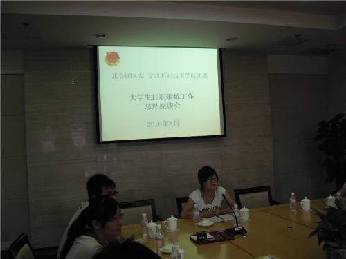8月20日上午,由北仑团区委,宁波职业技术学院团委共同举办的大学生挂职锻炼工作总结座谈会,在北仑行政中心A207举行。出席此次会议的有:北仑团区委副书记袁波,宁波职业技术学院团委书记励宁。