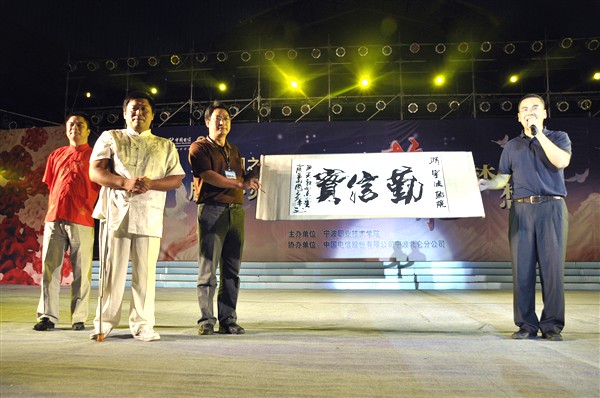 一出场便是掌声雷动的舞蹈,那艳丽舞动的身姿,如果不清楚他们的缺陷,谁会明白学习中的艰难。都说台上十分钟,台下十年功,他们每一个动作都带着痛苦并快乐的回忆。当获得第三届中华民间绝技大赛火柴盒演奏金奖的陈绍勤老师为同学表演的《苗岭的早晨》时,全场都在聆听,那心灵的歌声,都说艺术是无边无界的,任何一个没有生命的物体,在表演者的手上都会成为一种歌颂的力量。然后,那独腿的鹰之舞,却忽然让所有人树立起敬,仿佛他们摆动的不是身体,而是那想屹立在山巅俯视的雄鹰。之后,双臂、左腿截肢的书法家王建华衔笔写下我院校训“勤、信、实”并赠予我院,借此表达对我院支持残疾人事业的感谢。