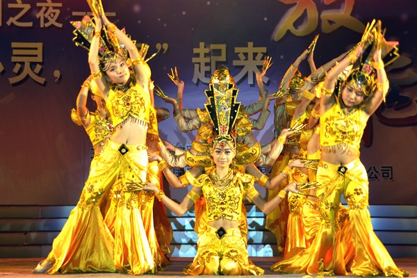 当然,精彩总是放到最后的。随后,一只只优雅的手举过头顶,满步蹒跚的走上舞台,人们马上就联想到曾经在电视上才能看到的《千手观音》将要步入视线。的确,那婀娜的身姿,那甜蜜的笑容,无不让人感到震撼。