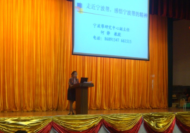 随后,精彩依旧。“走进宁波帮,感悟宁波帮的精神”。一句闪亮的口号拉开了何静教授就“何为宁波帮”、“宁波帮为何受世人瞩目”、“宁波帮精神”、“宁波帮历史贡献”四方面给同学们上了一课,起先,她向同学们解释了宁波帮的含义、界定。接下来,引语邓小平的“把全世界的宁波帮动员起来建设宁波”,折射出宁波帮的风采。最后,通过举例宁波帮人士走向事业巅峰之后对家乡的慈善事迹。展现了“树高不忘根的赤子精神”,更震撼人心的是,她讲述的邵逸夫,李达三等人士的丰功伟绩,均给大家带来了“不甘落后的开拓精神”的启迪。