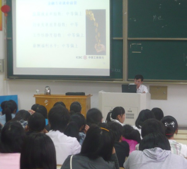 李行长围绕当前金融专业的发展形势,从“金融专业学生就业形势”、“金融行业近年人员招聘情况”以及“目前适岗训练注意事项”三方面内容作了详细分析。首先,他给同学们介绍了金融业最为基础的专业知识,来引导同学们对金融业初步的了解。接着他给同学们就金融专业的就业前景作了分析,他列出了“ 十一五”期间高校就业形势的数据,并数据分析:金融行业的总体人数和就业人数都呈逐年递增趋势,但是就业率有所下滑。他告诫同学凡事不能只看表象,必须要保持清醒的头脑,真才实学;同时他还鼓励同学,虽然就业率有所下滑,但金融专业应届就业率指数、行业发展前景指数、工作恬静度指数以及薪酬福利水平都属于中等偏上。他还向同学们介绍了他行近年的人员招聘情况和应聘、招录的流程和条件。他表示:近年来在他行高职毕业生的就业率呈大幅度增长,并勉励在座的同学在学好金融保险专业的同时,能够在此基础上加以创优。