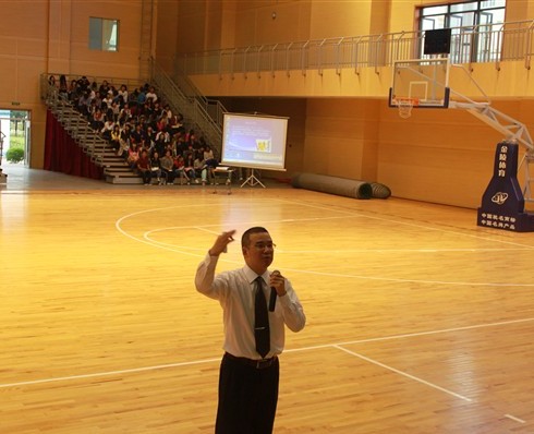 9月29日上午,顾国华体育中心座无虚席,一千六百余名新生聆听了此次讲座。在一片掌声中,主持人的一句:“Hello,welcome to NingBo Vocational College”拉开了讲座序幕。宁职院党委副书记史习明老师带领大家走进成功大学。作为金牌讲师的他首先来到会场中央,向学生深鞠一躬,同学们也随之热情高涨。