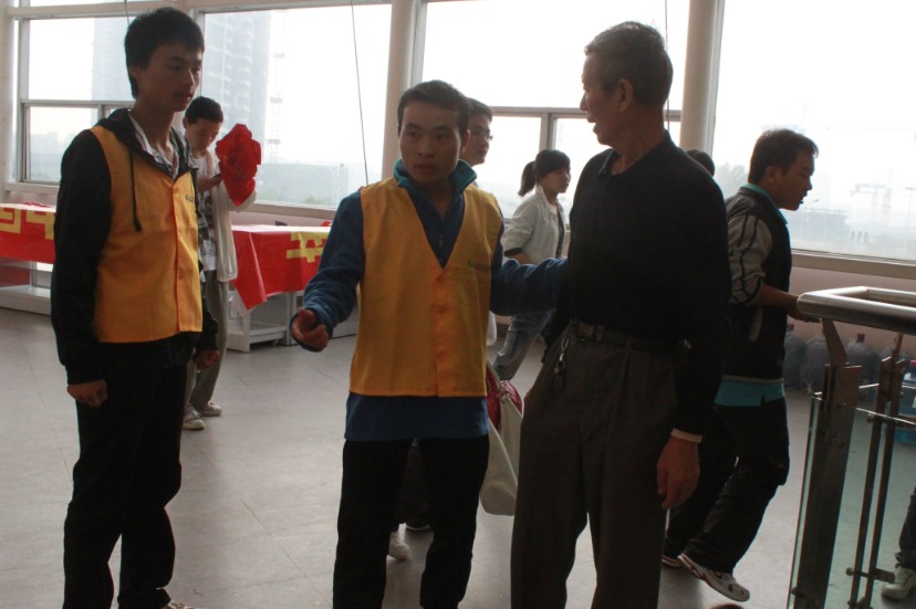 大会开始前,我们志愿者站在各个大门入口处面带微笑的迎接到来的观众们,他们就像春天的花朵一样朝气蓬勃。在馆内,老人们手持门票找不到门票上标注的座位号时,我们志愿者们就认真耐心的为老人导路,更有志愿者一路小心搀扶年迈的老人入席,他们就如同晨间的太阳给人温暖。现场来了近四千名观众,我们志愿者都各就其位,有序的在入口处服务老人们。展示大会开始了,观众们都已经坐在位置上等待表演开始,而志愿者的工作也告一段落,他们工作的认真态度和服务质量得到了老人们的一致称赞。