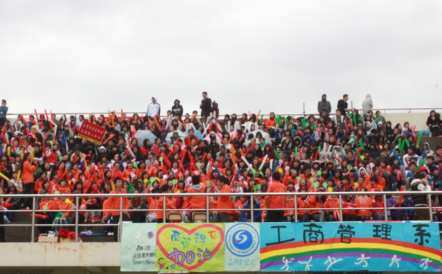啦啦队员们在领队的组织下,有理又有序地在为运动员们喝彩。每当工商管理系的运动员经过看台,便会想起震耳欲聋的呐喊声“工管出场,势不可挡”,此起彼伏。啦啦队棒撞击的响声和惊天动地的鼓声交相辉映。最值得一提的是啦啦队们改编的加油歌,“好男儿加油!加油!工商管理先前走,站出来英雄般风流;美女子加油!加油!工商管理在遨游,商帮文化传统化的时候,运动健儿你是我的光荣……”为赛场增添了一份激情与愉悦。运动员们在他们的鼓励下也屡屡取得了佳绩,为工商管理系增光增彩。