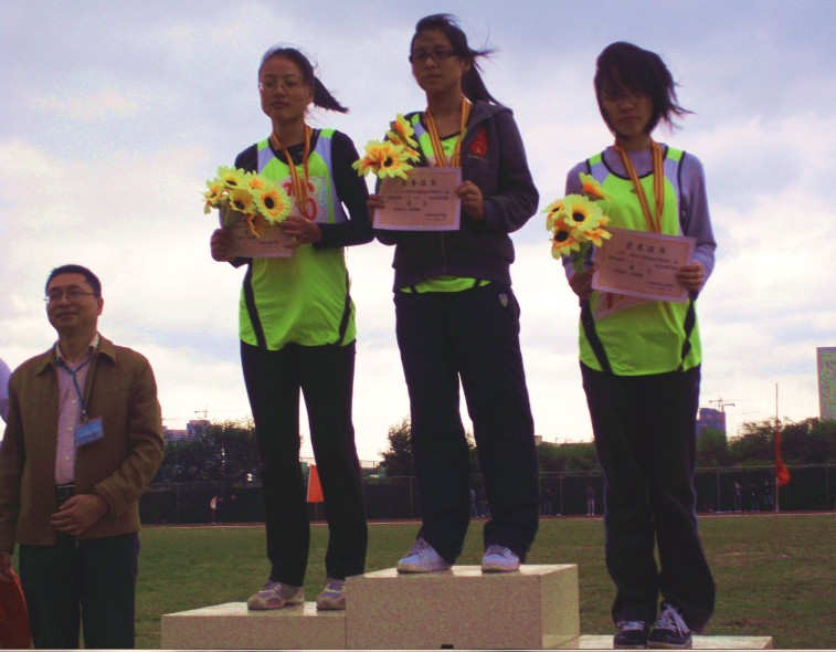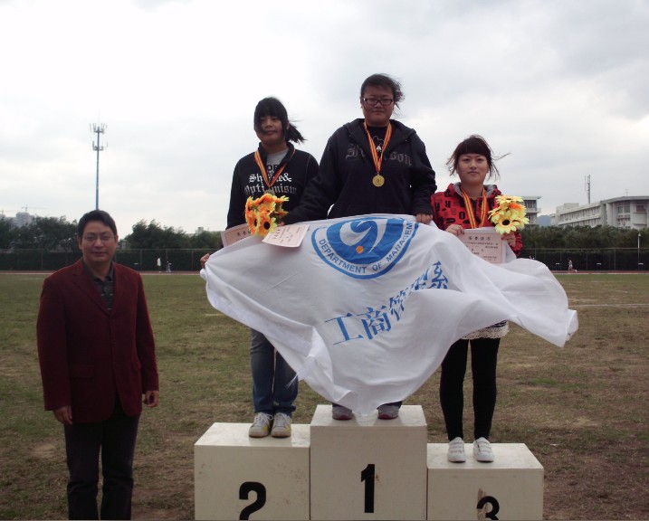 图为:工商管理系在女子铅球比赛中取得第一、三名