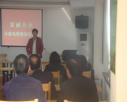 下午1:40分,以“挥洒青春 奉献真情”为主题的义务家电维修知识讲座在北仑黄鹂社区委员会办公会议室如火如荼的开始了。居民们闻讯赶来,讲座期间纷纷提出了家里电器中(如:电风扇、电视机、台灯、收音机、音响等各种家电)所出现的问题。张老师运用自己的知识和经验,一一解说其电器所存在的问题并以实际动手维修出故障的电器。