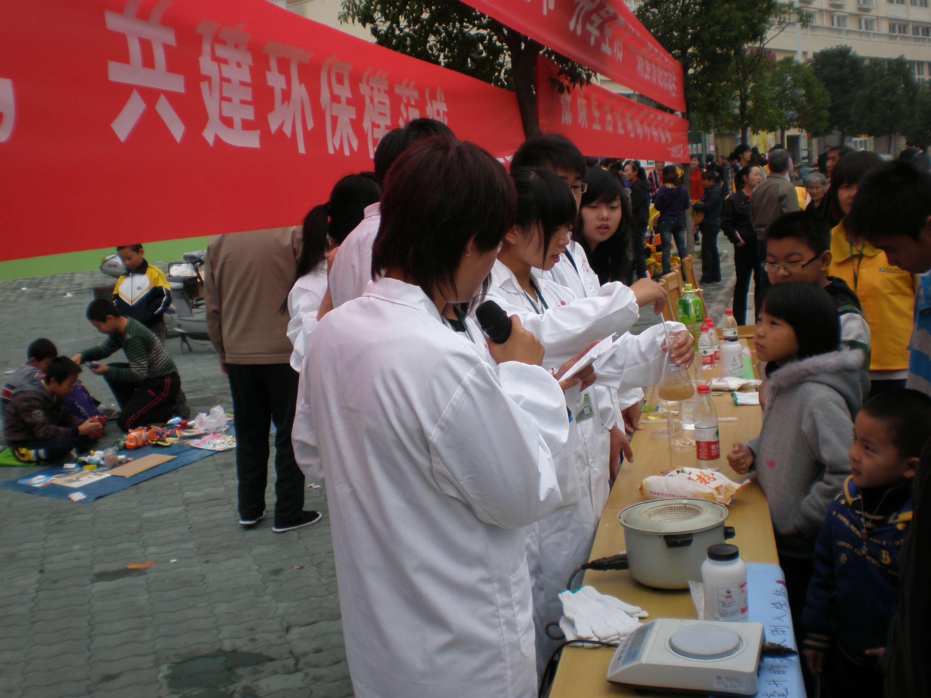 志愿者到达社区之后,按照原先分配好的工作,有条不紊的忙碌起来。有的在树上挂起横幅;有的去社区办公室借来桌子和椅子;有的将实验器材一一排开,做好预备工作;有的拿起话筒扯开嗓子拉揽过往群众,一切准备就绪之后,实验终于开始。随着实验的顺利进行,围观的群众也逐渐增多,完全压过其他摊位的人数。群众个个怀着好奇的心态,用期待的眼神看着志愿者做试验。试剂变色的时候,群众不禁发出惊叹声,交头接耳的说着心里的惊讶。而当肥皂成型的时候,群众像是见证了奇迹一般,纷纷上去用手捏着肥皂,胆大的群众直接用肥皂洗手,一边洗一边不可思议的说:“还真跟家里的一样。”