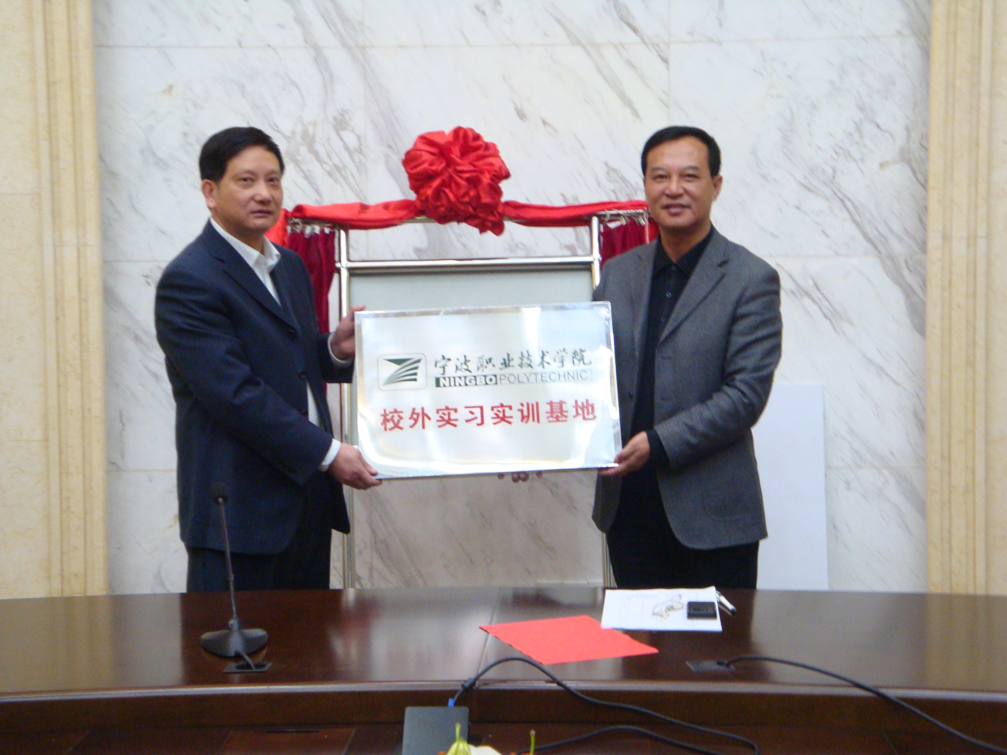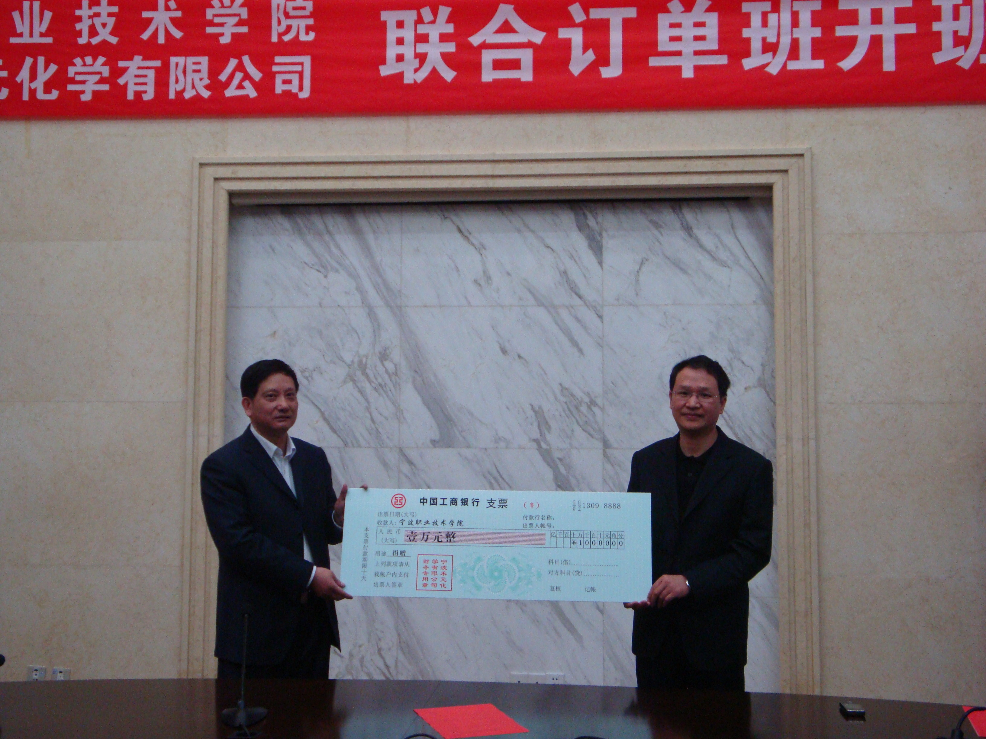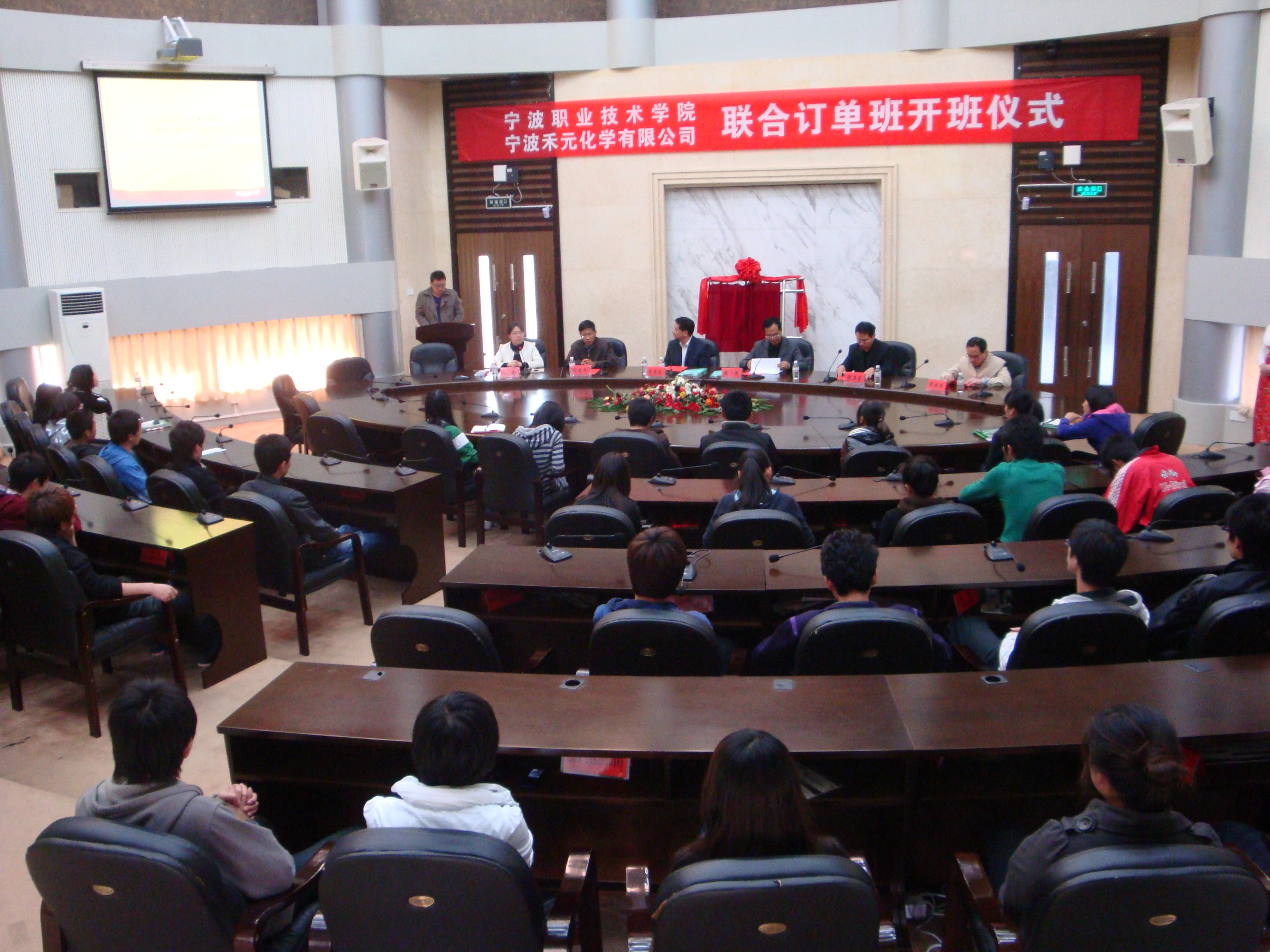 2010年11月9日宁波职业技术学院应用化工系与宁波禾元化学有限公司联合实训基地、联合订单班签约暨联合订单班开班仪式于行政楼国际会议厅正式拉开帷幕。宁波禾元化学有限公司朱建农经理、宁波职业技术学院副院长张学库老师、应用化工系的领导们和禾元班全体同学参加了本次开班仪式。会上张学库院长和朱建农经理签订了联合订单班人才培养协议书、产学合作协议并授牌。