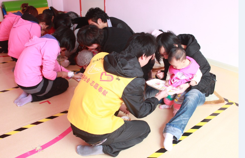 不同月龄组的小朋友都有对应不同难度指数的比赛项目,小朋友的比赛项目在我们看来十分简单,小朋友们有用手指抓小馒头,扶杆站,大一点的小朋友则有认颜色,搭连环扣,跨栏等具有针对性的比赛。但这些前来的小朋友都属于婴幼儿,有些站不稳,有些还未长牙,志愿者们俯着身子耐心地手把手地引导小朋友们做比赛动作,一次又一次地耐心认真引导人类最基本的动作和认知能力。我系志愿者们虽然很辛苦地忙碌着安慰哭闹的小朋友,搬运比赛道具,给小朋友穿衣等等,但都表示这样的活动很有意义。二十出头的大学生在这样充满希望欢乐的早教国里也像个大孩子一般。