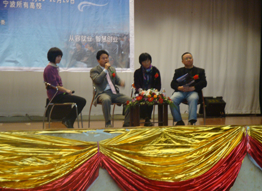 11月18日中午1:30分,在东校区大剧院内举行了第二届就业与创业之旅,第十场宁波优秀企业家走进宁波高校网络电视论坛的讲座。此次活动由宁波市经济委员会、宁波市企业联合会、共青团宁波市委、宁波市企业家协会主办,电子信息工程系承办。邀请的嘉宾有来自浙江海商网络科技有限公司董事长、总裁陈则立先生,太平洋人寿保险公司宁波分公司总经理储时君女士和宁波银亿集团有限公司办公室主任黄金龙先生。本次活动的主题为:从容就业、智慧创业。