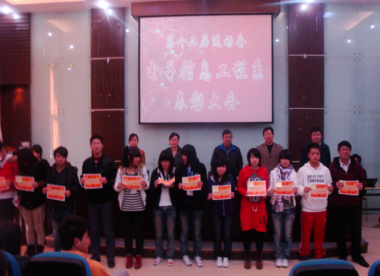 之后电子信息工程系领导分别对本次运动会上表现优秀的学生和班级进行表彰。其中包括电子信息工程系运动会道德风尚奖获得者团队为:网络3091班、电子3103班、电子3101班、通信3090班、电子3102班;优秀运动员荣誉称号以及对在本次运动会上辛苦工作的体育部、志愿者部、信息部、生活部、办公室、学习部、素质拓展部、纪检部、宣传部、文娱部、外联部、组织部等学生会各部门优秀干事进行“优秀工作者”称号的荣誉表彰。