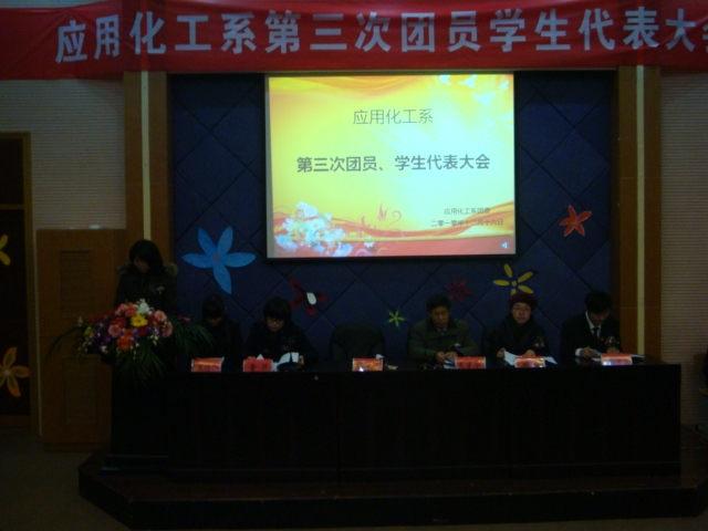 宁波职业技术学院应用化工系第三次团员学生代表大会在庄严的国歌声中拉开了帷幕。首先由刘汉森同学做大会开幕词,接着由院团委胡丹莹老师在发言中充分肯定了化工系在过去一年的时间里所取得成绩,并给予团学干部提出了几点要求,她希望学生干部首先要有团队协作的精神,勇于创新。再者是有带头,无论是学习还是工作中,我们要以身作则。最后希望化工系的团学工作能在上新台阶。