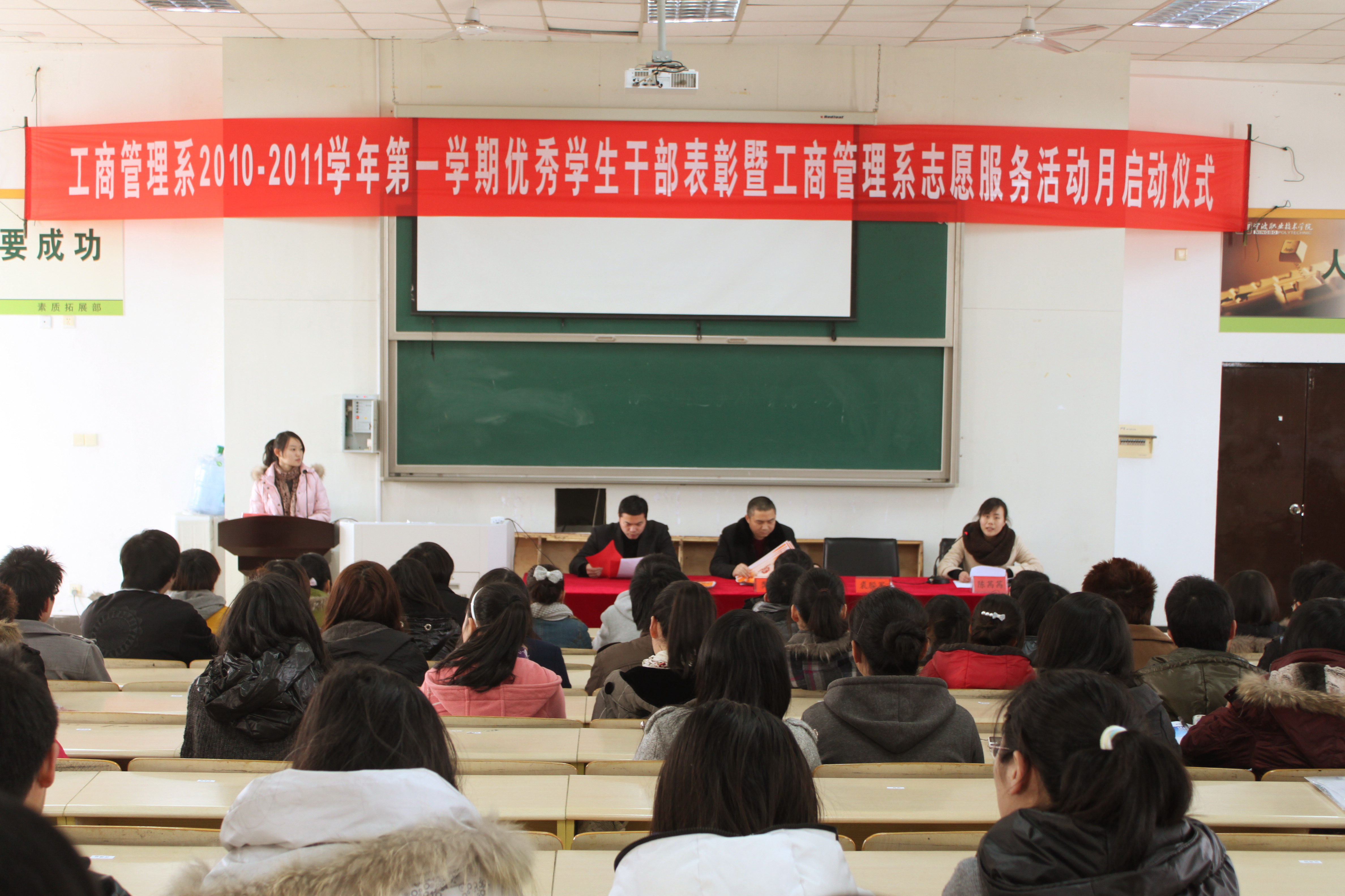 2010―2011学年第一学期涌现出许多优秀的学生干部,为提高其积极性,表彰部分工作积极、能力突出的学生干部,建设一支“服务型、学习型、有能力、有形象”的学生干部队伍,特进行表彰。同时,为积极落实学院团委将志愿服务工作作为团学主要工作的指示精神,工商管理系将确立今年三月为工商管理系志愿服务活动月,并于3月3日12:15在东校区2#504进行启动仪式。