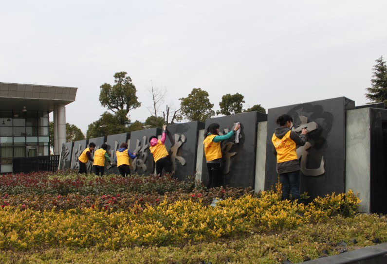 图为:工商管理系志愿者擦拭宁职院大门的牌字